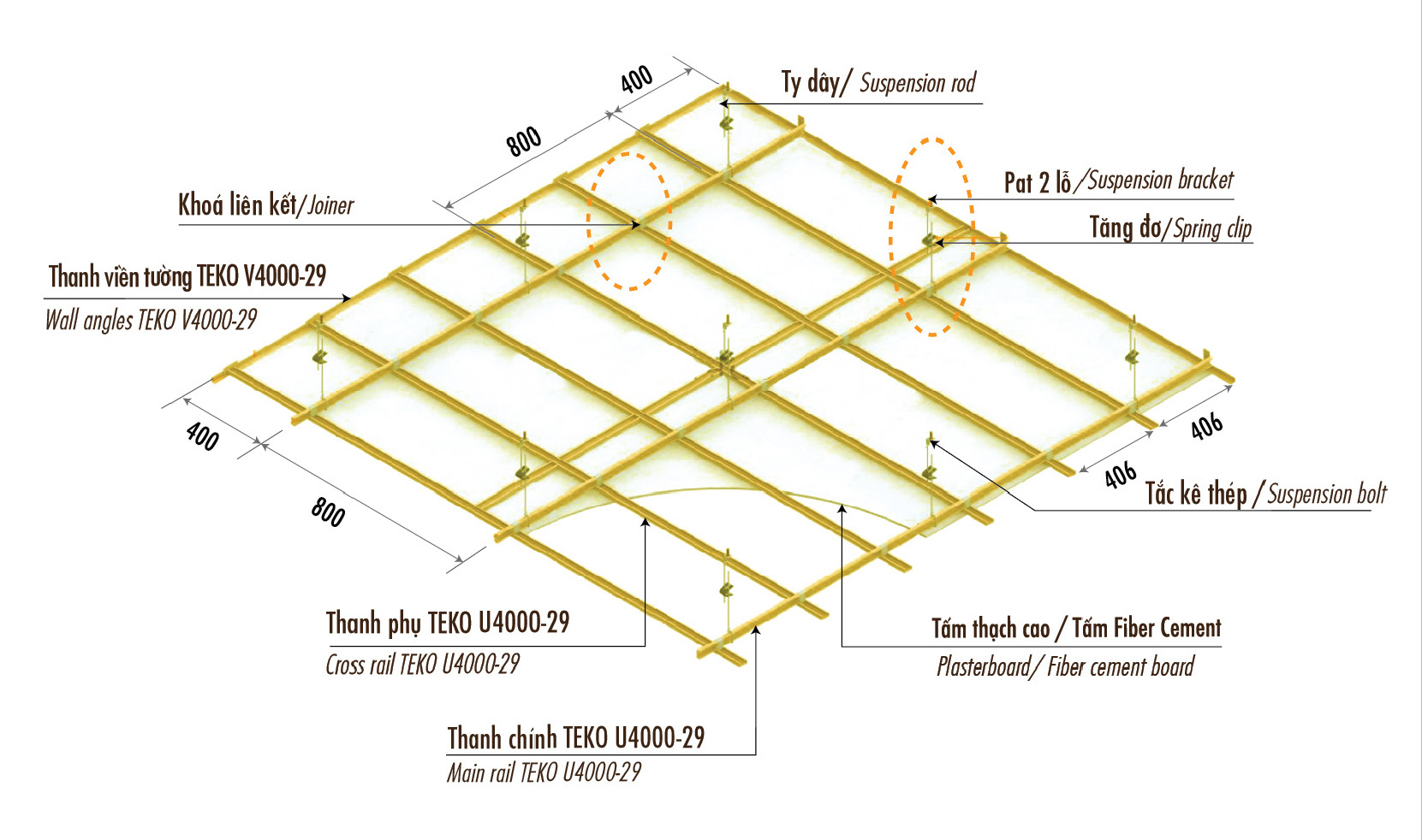 Khung trần thạch cao chìm TEKO U4000-29 của Công ty cổ phần Hiệp Vĩnh Phú gồm có thanh chính và thanh phụ liên kết với nhau bằng khóa liên kết. Đáp ứng yêu cầu cao về kỹ thuật, an toàn cho công trình và nguời sử dụng.